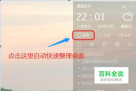首先也是最主要的功能就是整理电脑桌面,有些人的电脑桌面上放置了很多的文件,其中包括图片、文件夹以及视频等,这时我们只需点击桌面助手挂件上方的“桌面”即可快速的将它们按照类别归类到一起,而桌面上只留下常规的一些应用;
