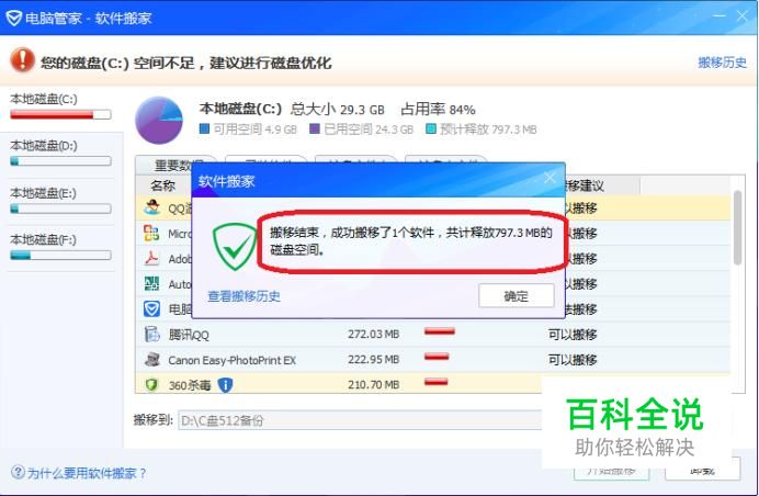 搬移可能会需要一些时间,搬移之后,系统会出现如图所示的提示,点击确定,就可以继续搬移其他软件了。