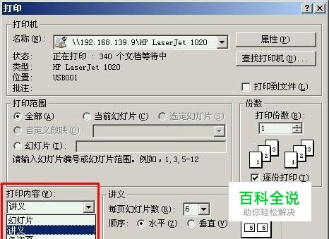 設置多幀列印 在“列印內容”一欄中設置為“講義”,然後再設置一下右邊的其他參數,如每頁列印幻燈片數,列印順序,是否加框等,右邊有小圖預覽列印排列效果,設置好之後,確定列印即可。