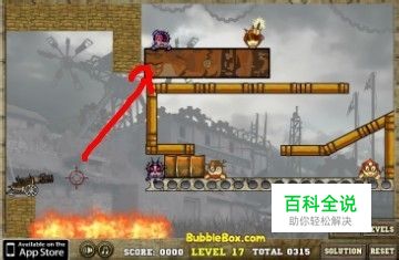 《大炮轰小人3》是一款休闲娱乐的小游戏,里面有许多的不同的关卡,有很多比较简单,但是有有部分比较困难的。我在网上看到许多玩家寻求大炮轰小人3的攻 略,刚好自己很喜欢玩这个游戏,就顺便写一些比较有难度的关卡攻略出来给大家看看,主要是一个打法的介绍,所以就没做视频攻略,而选择图文攻略。这次先做 17-18关的攻略下面列举一些有难度的关卡的打法公路: 第17关: 这是关卡开始的小人布局,先往箭头的方向射击让木块倾斜,使得两个小人往下滑动。 等阳光小人先滑到这里的时候就开始用炮弹射击小人隔壁的油桶,如下图 这样就可以让怪物小人滑动下来想怎么死就怎么死了 第18关卡:这一关的关键是要瞄准好击打车轮的位置,大概往我的鼠标所在地方发射,炮弹就会想左上方弹出,从而避开了炸到下面的小人。 当车轮砸下木条之后,怪物小人会被抛过来,过来这边之后基本上没有希望,只有重来了。所以当怪物小人还在空中的时候,不断用炮弹击打他,注意不要让炮弹掉在左边阳光小人的区域,这样就完成了。
