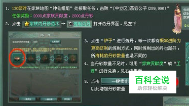 接取“激活内丹修炼术”任务 前往中立区论剑山庄附近,击败“慕容公子” ,回复家族神仙姐姐。 任务奖励:2000点家族贡献度,2000点丹砂。