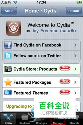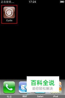 按下iPhone主屏幕上的“Cydia” 图标按钮启动Cydia程序(如果启动Cydia时,出现Reorganizing提示,则请耐心等待,直到文件迁移完成,在此过程中请勿操作你的iPhone,否则可能或造成程序丢失情况,迁移文件一般在5分钟左右完成)