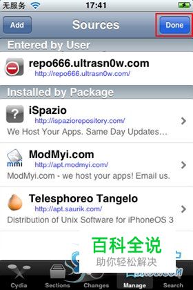 如果ultrasn0w源地址已经在源列表里则跳到第九步,否则按照下面的操作添加ultrasn0w源地址,点击右上角的“Edit”按钮