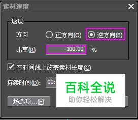 接下来就制作视频倒放效果,选中素材,右键 — 时间效果 — 速度,或者直接按快捷键Alt+E,然后会弹出速度的对话框,选择逆方向,这时你就会发现速度变为负数了,而且还可以通过调节数值来改变播放速度的快慢。