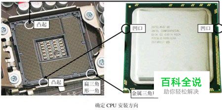 步骤3:仔细观察CPU正而,会发现某个角有一个金属三角形符号,同时在主板插座上有个角呈扃三角形状(或同样有个金属三角形符号k安装时,将CPU有金属三角形的那个角对准插座上呈扁三角形的那个角,就能确定CPU安装方向(这种方法适用于所有品牌和规格CPU的安装)。此外,在IntelLGA775、LGA1366,LGA1156架构的CPU上有两个凹口,而插座上会有两个凸起,安装时,将两个凹口和凸起对准,这样也可按正确方向安装CPU,如图3所示。