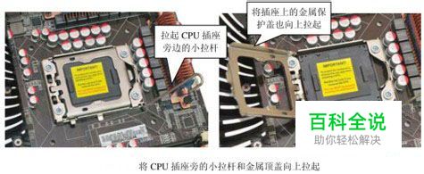 步骤1:把CPU插座旁的小拉杆向外侧稍稍拉动,并向上扳到垂直的位置,接着将插座上的金属顶盖也向上拉起,如图1所示。