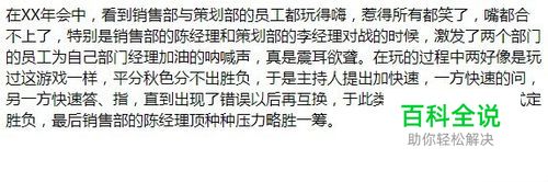 游戏规则: 参加游戏的人可以是多数,主持人要事先准备好一些词语。主持人说一个词语,要参加游戏的人反着说一遍,比如“新年好”,游戏者要立刻说出“好年新”,说错或者猛住的人即被淘汰。从三个字开始说起,第二轮四个字,第三轮五个字,以此类推,估计到五个字以上的时候游戏者就所剩无几了。