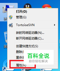在电脑桌面上找到我的计算机,鼠标指针移动到我的计算机然后右键-->单击属性按钮,如图所示