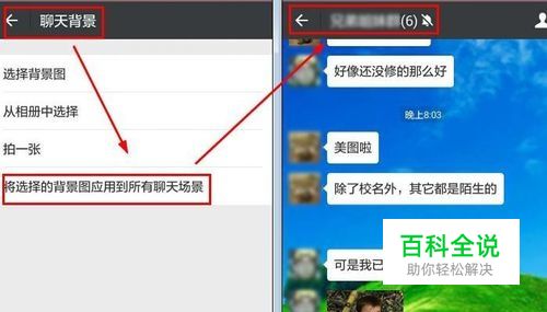 3、再回到聊天背景界面,选择“将背景图应用到所有的聊天场景”,这样所有的聊天场景是同样的背景图片。 小编有话说:睡觉前经常长时间关灯玩手机会导致青光眼、干眼症、甚至失明?这绝非危言耸听。专家提醒说,在昏暗的光线下用眼,会导致瞳孔长时间扩大,堵塞眼内液体循环流通,很容易导致青光眼的发生,甚至导致永久失明。为你身体健康,晚上熄灯后尽量不玩手机。