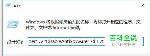 输入”reg add "HKEY_LOCAL_MACHINE\SOFTWARE\Policies\Microsoft\Windows Defender" /v "DisableAntiSpyware" /d 1 /t REG_DWORD /f“