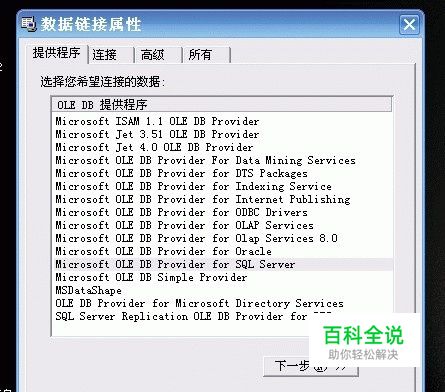 在“提供程序”这个选项卡上 选择“ Microsoft OLE DB Provider For SQL Server”这个OLEDB 的驱动程序,点 “下一步”会出现下图(图三):