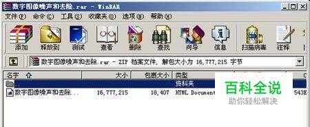 第四步:现在再用WinRAR打开“数字图像噪声和去除.zip”文件,你会惊奇地发现,压缩包中显示的原文件体积达到了16777KB(见图6),也就是16MB!现在你明白我们第三步中所做修改的目的了吧,我们就是要把原文件从“蟋蟀”变成“大象”!而且,现在你把压缩包中的“数字图像噪声和去除.htm”文件解压出来,其文件体积仍然是16MB,而且可以正常打开浏览。 谜底揭晓了第五步:接下来就很简单了,把这个修改后的ZIP格式变成RAR格式即可,如果用WinRAR“工具”菜单中的“转换档案文件格式”功能转换后的压缩比会稍微缩小,这里我们直接将“数字图像噪声和去除.zip”改名为“数字图像噪声和去除.rar”,就做成了最开始看到的那个超级压缩包。 3.文件压缩原理 文件压缩分为有损压缩和无损压缩两种,我们常用的WinRAR、WinZip都是属于无损压缩,其基本原理都是一样的,简单地说也就是把文件中的重复数据用更简洁的方法表示,例如一个文件中有1000个字母A,那么这将占用1KB的数据空间,如果用压缩算法就可以用1000A来表示,那么它只需要5个字节的数据空间,压缩比达到了200倍。 那么由此看来,1000倍甚至更高倍的压缩比是可以实现的,但要求源文件必须有足够多的重复数据。不过,我们平时使用的文件都不可能是这样的,所以通常文件压缩比都在10倍以下,如果某个软件声称对任何文件都能够产生这种超高压缩比的话,那它肯定就是具有欺骗性质的了。 小编有话说:很多网上下载的文件只有300MB或400MB,但是解压后,居然可以达到2GB甚至更多,也许你会奇怪,为什么你用WinRAR压缩同样的文件,就没有这样的压缩效果呢?其实这是因为这些文件是用多款不同的压缩软件进行压缩的,用压缩音频最好的压缩软件压缩音频文件,用压缩动画最好的压缩软件压缩动画文件。而且在压缩时所选的参数也是最佳的,这样也就保证了最后生成的压缩文件是最小的