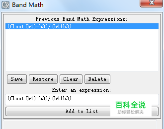 双击Band Math,在弹出对话框界,面输入NDVI计算公式。此处要注意数据类型,本次采用的数据类型是字节型,所以要进行数据类型转换,将其中一个变量转换为浮点型即可。输入后,点击Add to list进行添加公式并选中输入的公式。