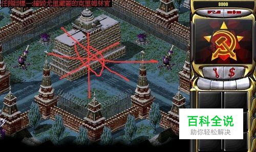 首先系统给出的是基地车和坦克还有天启一辆少量兵力和狗。展开基地车进行建造,依次制造电厂,矿产,兵营。然后派出坦克天启及狗对敌上方的基地进行攻击,利用狗消灭守卫敌军,然后利用坦克天启对敌的核磁圈进行攻击,记得清除敌的防空炮。留下两个发电厂待用。