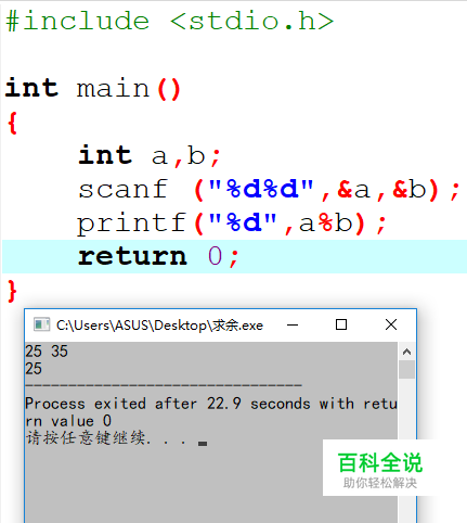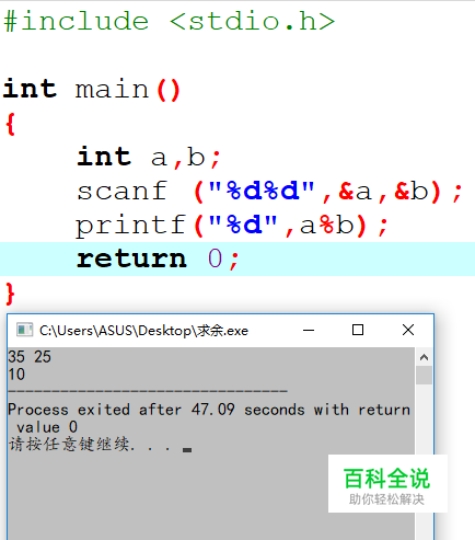 C语言中求余的表达式为A%B,通常有两种如下的情况(用35与25为例):