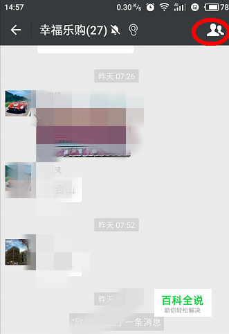 点击微信群,进入微信群聊天页面,再点击右上角像小人头像,如图所示: