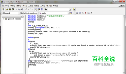 程序其他部分 printf("please input the number you guess between 0 to 100\t");scanf("%d",&g); while(g!=n){if(g<n) { d=g; printf("That was small,\n please guess it again and input a number between %d to %d\n",d,c); scanf("%d",&t);g=t;}if(g>n) {c=g; printf("That was large,\n please guess it again \ and input a number between %d to %d\n",d,c) ; scanf("%d",&t);g=t;} }if(g==n)printf("\t\t\t|----------|\n\t\t\t|you got it|\n\t\t\t|----------|\n");printf("\n\t\t\t Game over\n");getch();} 下如为运行结果
