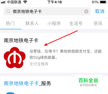 我们在搜索框中输入南京地铁电子卡,出现如图所示选项,我们点击它