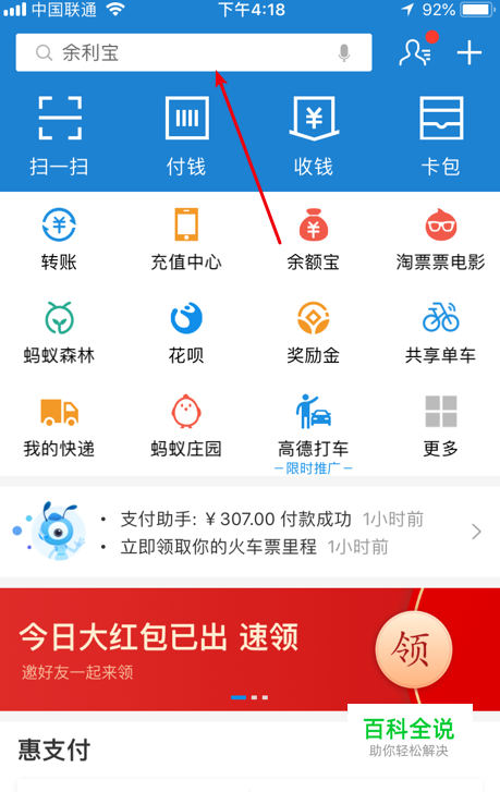 首先,我们点击打开支付宝首页, 然后点击页面上方的搜索框,如图所示