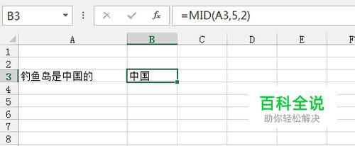 第二种:把一个单元格中间特定几个字符取出来 比如我要从“钓鱼岛是中国的”这几个字中取出“中国”。 先在单元格中输入:“钓鱼岛是中国的” 然后再从第5个开始取单元格中2个字符“中国”。 例如:先在A3中输入 钓鱼岛是中国的 然后在其他任意单元格中输入 =mid(A3,5,2) 回车 此时,表示从单元格中存放的“钓鱼岛是中国的”这一串字符中从第5个开始取出2个字,并显示到单元格中。
