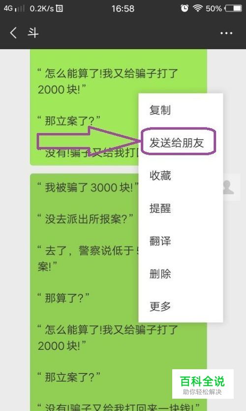 然后我们可以按住我们要群发的短信,这时候就会弹出复制和其他方面的菜单栏,在这些菜单栏中可以看到“发送给好友”
