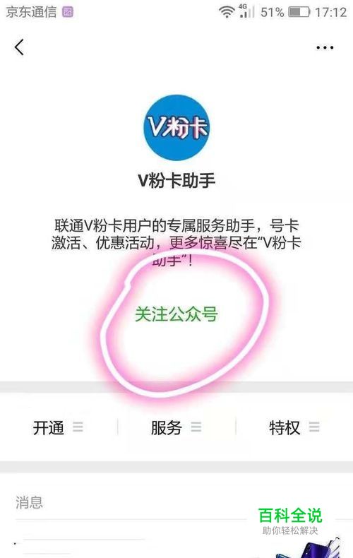 点击后进入到“V粉卡助手”注公众号的页面,可见工具栏有“开通”、“服务”及“特权”三个菜单。