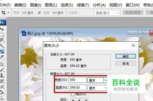在宽度与高度栏输入数值,即可更改画布大小。这里与图像大小不一样,没有约束比例一项,所以不会因为更改其中一个数值,导致画布同比例更改。