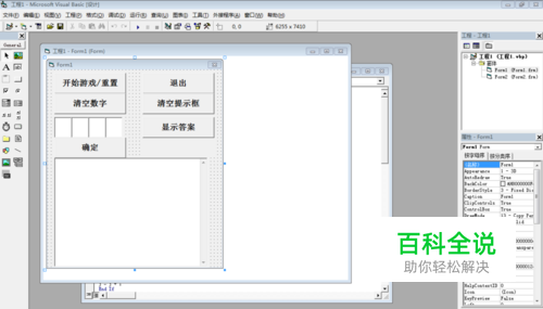 打开vb6.0,如图设计Form1界面 Form1 的 BorderStyle属性设为3-…… Command1 为 开始游戏/重置 Command2 为 确定 Command3 为 退出 Command4 为 显示答案 Command5 为 清除数字 Command6 为 清空提示框 Text1至4 为 依次从左到右的4个输入框,设Font属性为宋体,加粗,四号 Text5 为 大提示框,Scrollbars属性设置为2-Vertical,MultiLine 属性为true Label1 为 显示答案的提示框