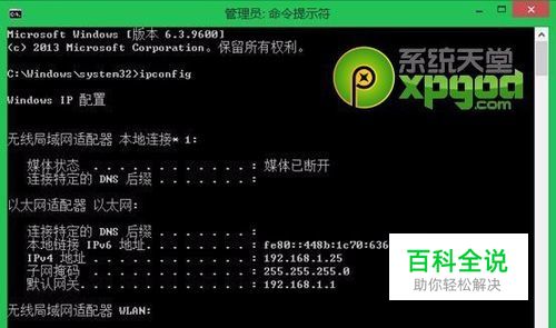 二、重新获取IP地址信息 当排除网线故障后,网络依然无法连接的时候,这时候我们就需要查看本机的IP地址,是否分配得当。 win8.1下,同时按下组合键(Win+X),选择命令符(管理员身份),输入ipconfig,进行查看。 假如出现以下情况或者IP地址是以169开头的时候,这就代表着网卡没能够获取到正确的IP地址。 假如用户是通过DHCP局域网方式获取上网的IP地址的话,我们能利用ipconfig /release命令释放现有的IP地址信息,并用ipconfig /renew从DHCP获取合适的IP地址。