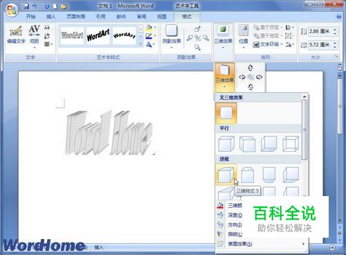 在Word2007文档中,艺术字的三维效果包括颜色、深度、方向、照明和表面效果等属性。用户可以为艺术字设置三维效果,具体操作步骤如下所述:
