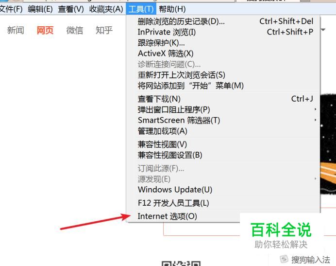 打开IE浏览器,点击‘工具’下的‘Internet选项’
