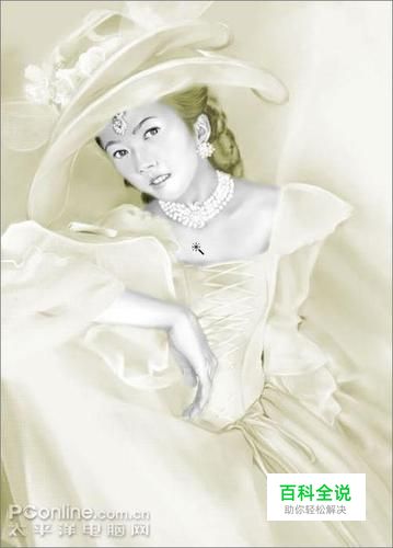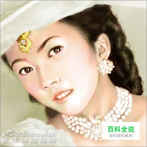 嘴唇我复制了一层,然后执行“滤镜—杂色—加杂色”,然后钩选“高斯分布”,调整数值到你满意。然后用橡皮工具擦除不需要的部分,这是处理完的效果。顺便为首饰上了色,还是喷笔。小技巧:如果你认为某部分皮肤过渡不够自然,复制图层,选择“滤镜—杂色—蒙尘与划痕”,调整到自己满意。然后用橡皮工具调低不透明度,擦除复制层上原来你满意的地方,然后合并图层,可反复进行。