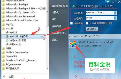 (3)如是全端口映射模式,在联机访问端同样需要安装使用nat123访问者。 如是非网站映射模式,联机访问端只需要知道映射后的外网地址和外网端口。