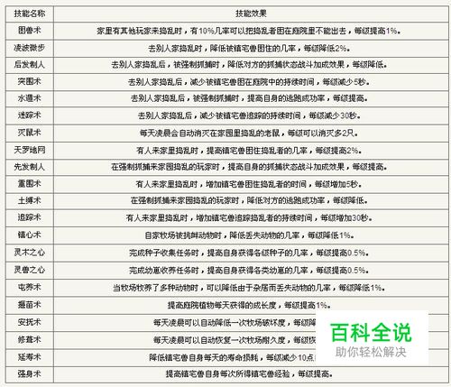 镇宅兽技能: 镇宅兽有1项天生技能:困兽术,当家里有其他玩家来捣乱时,有一定几率可以把捣乱者困在庭院中,几率随着镇宅兽等级提高而提高。 此外镇宅兽每升1级,都会后天领悟1个新镇宅技能,或者将已有的某个镇宅技能提升1级。召唤兽宝宝的原有技能会影响到镇宅兽每次升级可能领悟的镇宅技能。