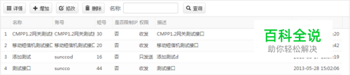 以列表的形式显示接口信息,可对接口进行增加、查看、修改以及删除等操作。 增加接口:选中要增加接口的分组,点击“增加”按钮填写接口名称、用户名、密码、应用序列号等信息,点击“提交”后即可成功增加接口。 查看接口信息:选中接口所在分组,可以根据指令进行查询,选中接口点击“详情”按钮可查看选中接口详情。 修改接口信息:选择接口,点击“修改”按钮可修改该接口的名称、用户名、密码等接口信息。 删除接口:选中要删除的接口,点击“删除”按钮即可删除接口。