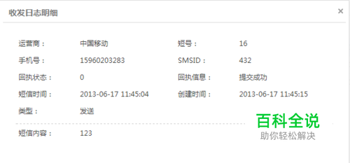选择接口分组,点击“收发日志”后以列表形式显示该接口分组下的所有收发的各大运营商的短信信息。 可以根据手机号码、发送时间段、类型(发送、接收)进行查询;点击“查看”可查看该短信的收发日志明细情况。