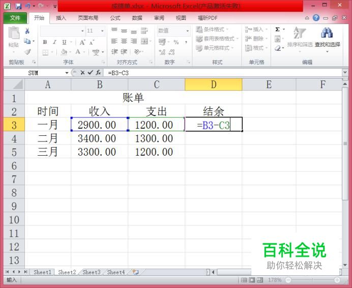 或者在D4单元格内输入”=“然后用鼠标点击”B4单元格,再在D4单元格内输入“-”,再点击C4单元格