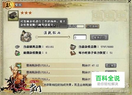 门派的后勤保障——柴房 柴房,是掌门调整门派中后勤效率的场所。掌门可以在此雇佣山下的村民充当杂役,以提升门派经营建设进度。
