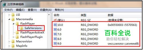 将 "HKEY_LOCAL_MACHINE\SOFTWARE\Macromedia\FlashPlayer\SafeVersions" 内的值删除(保留默认值)如下图所示。