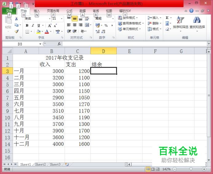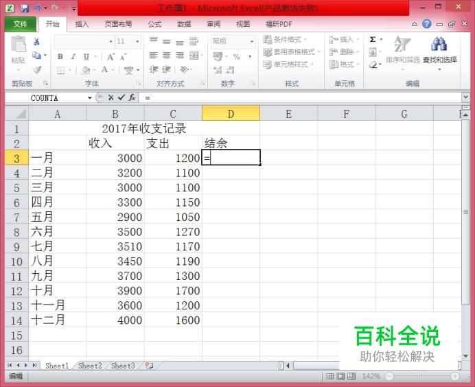 我们以简单的生活记账为例。首先,需要明确的是:收入-支出=结余。 将光标定位在D3单元格,并在D3单元格内先输入一个“=”