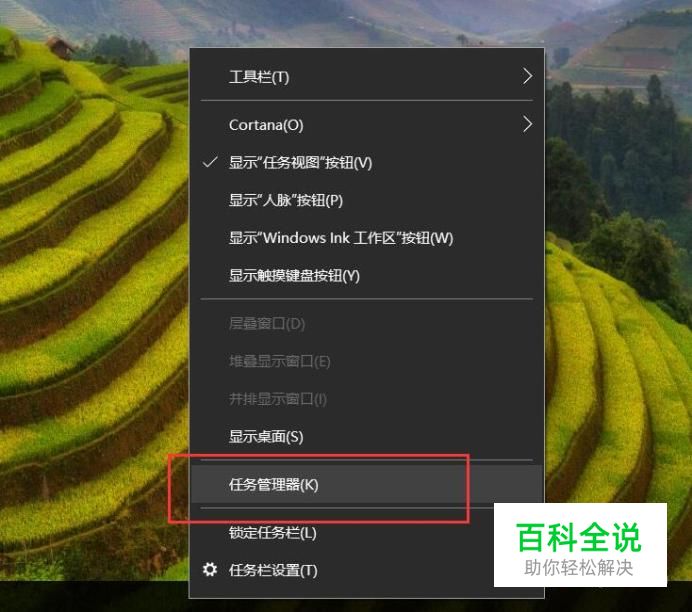首先,请大家在Windows系统桌面任务栏上击右键,选择“任务管理器”选项。