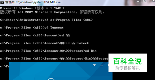第二步:在DOS界面内输入软件的位置。以打开QQ软件为例,我的QQ软件的具体位置是:c:\Program Files (x86)\Tencent\QQ\QQProtect\Bin. 首先从键盘输入cd c:\Program Files (x86),按enter键;再从输入cd Tencent,按enter键,以此类推直到Bin。(如图所示)