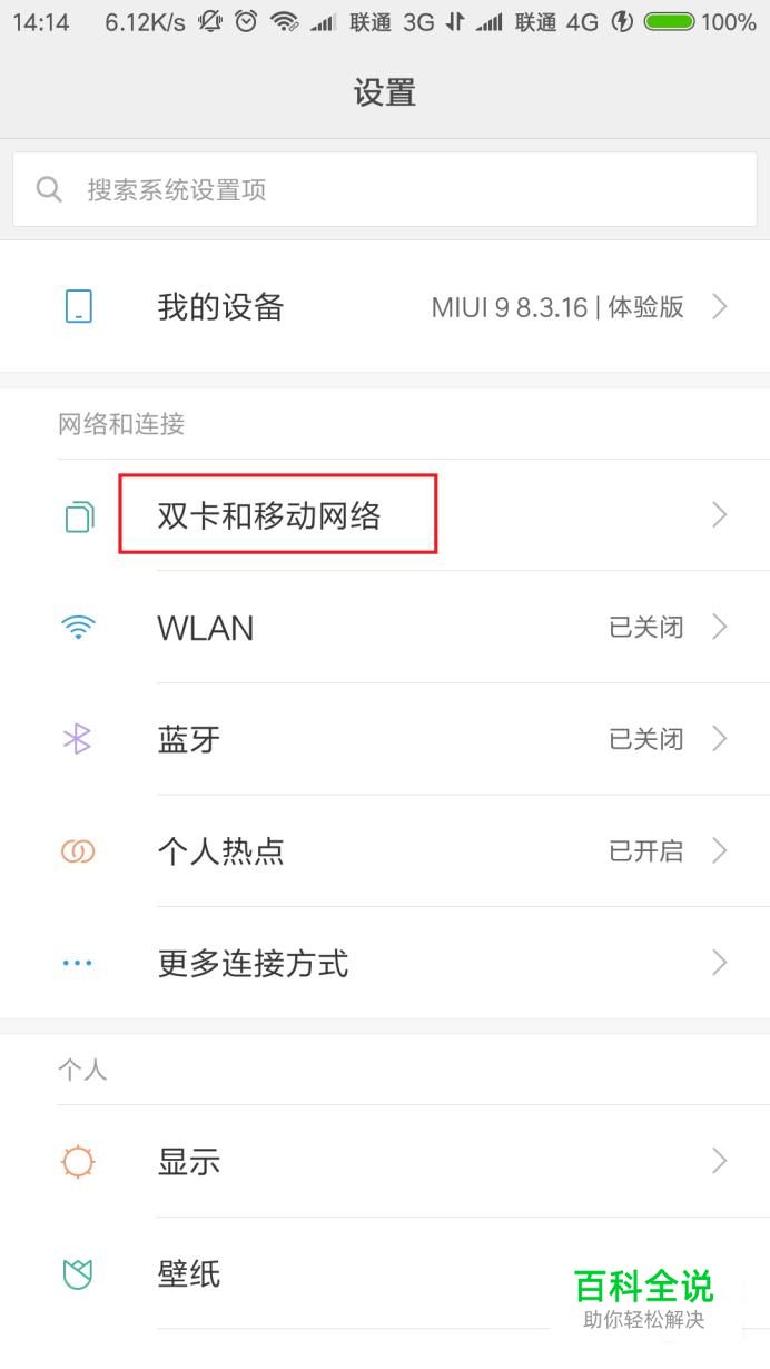 以MIUI系统为例,打开MIUI系统设置页面,点击“双卡和移动网络”设置选项。