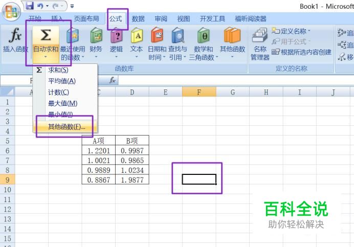 我们任意选中一个单元格,然后点击工具栏中的公式, 点击自动求和的下拉箭头,选择其他函数;