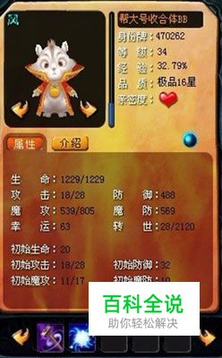 咋看之下,大家是不是以为41*的莎菲是磨血的BB呢?其实不然,这是我拿来敲BOSS的BB。这也是众多人的误区,以为高星BB不能敲BOSS,其实并不是这样的。 请各位先看一幅图: BOSS的爆率其实和BB的幸运有一定的关系,本人一般选幸运60以上的BB敲BOSS。一般准备两个,一个32级要有星级,横扫戈壁这个漏油的地方,一个42级高攻高星BB则是横扫55以上的BOSS。 而树心的BOSS,本人也很是大爱,石头爆得最多。不过高战之后打不了,太容易死了,也只有忍痛割爱。不过打法我还记得,准备一个16级的1—2*法师GF不进化,学暴雷,敲到没血或者血丝,这要看你敲得多重了。有时候有一些血丝敲一下还能活,有时候敲一下就不能活了。这些是看经验而定,如果怕的话就留血丝。