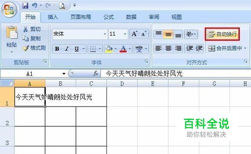 第二步:选中要换行的单元格,单击菜单栏中的“自动换行”按钮。