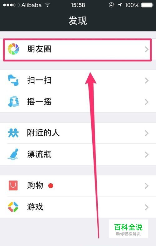 在微信面板底部,找到并点击“发现”这个板块并找到新页面中顶部的“朋友圈”这一项,也是点击进入下一页面。