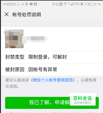 接下来我们可以看到自己微信被封的类型和原因。比如我的就是可解封的类型,原因的话说是异常。至于什么异常到是不得而知,像我这种老实人也没干什么违法的事。估计异地登录、长时间不登吧。 点击申请解封。
