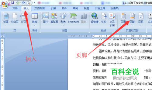 点击任务栏的“插入”,如果页码是标注在页脚,接着点击“页脚”。