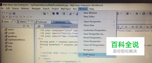 第二,打开Myeclipse,在菜单栏上单击window,选择preferences,如下图所示: